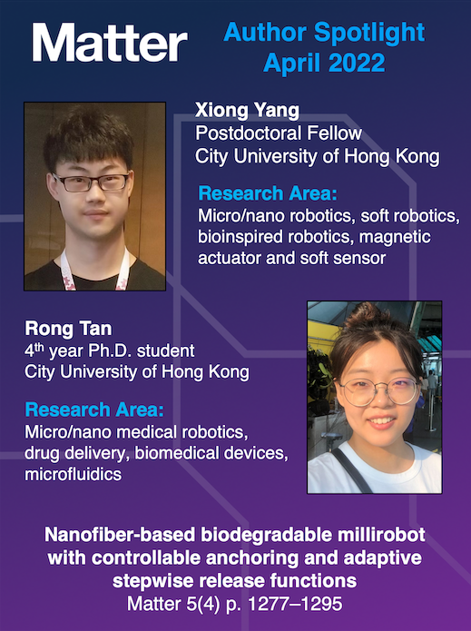 Xiong Yang and Rong Tan are awarded the MatterAuthorSpotlight for their work “Nanofiber-based biodegradable millirobot with controllable anchoring and adaptive stepwise release functions” in April 2022. Congratulations!